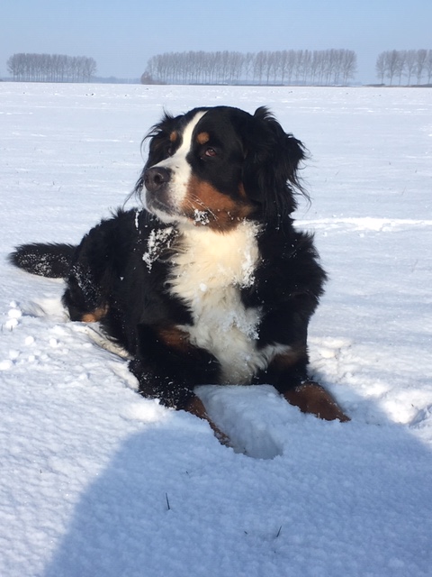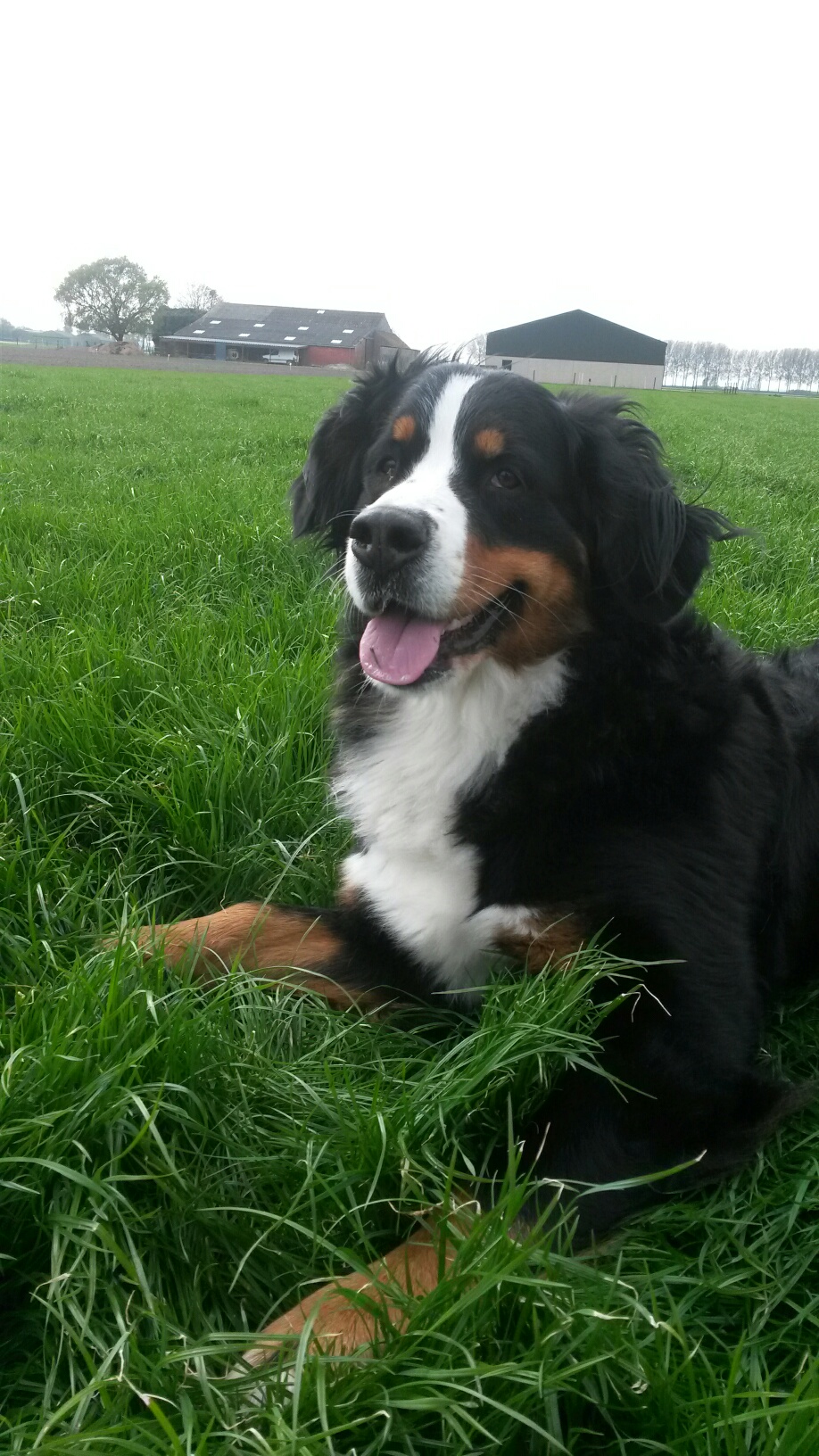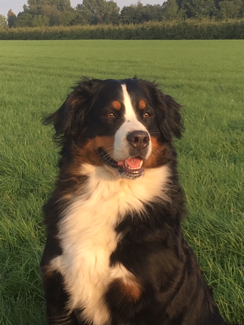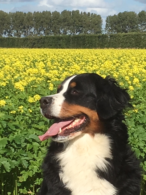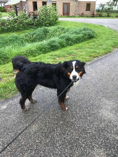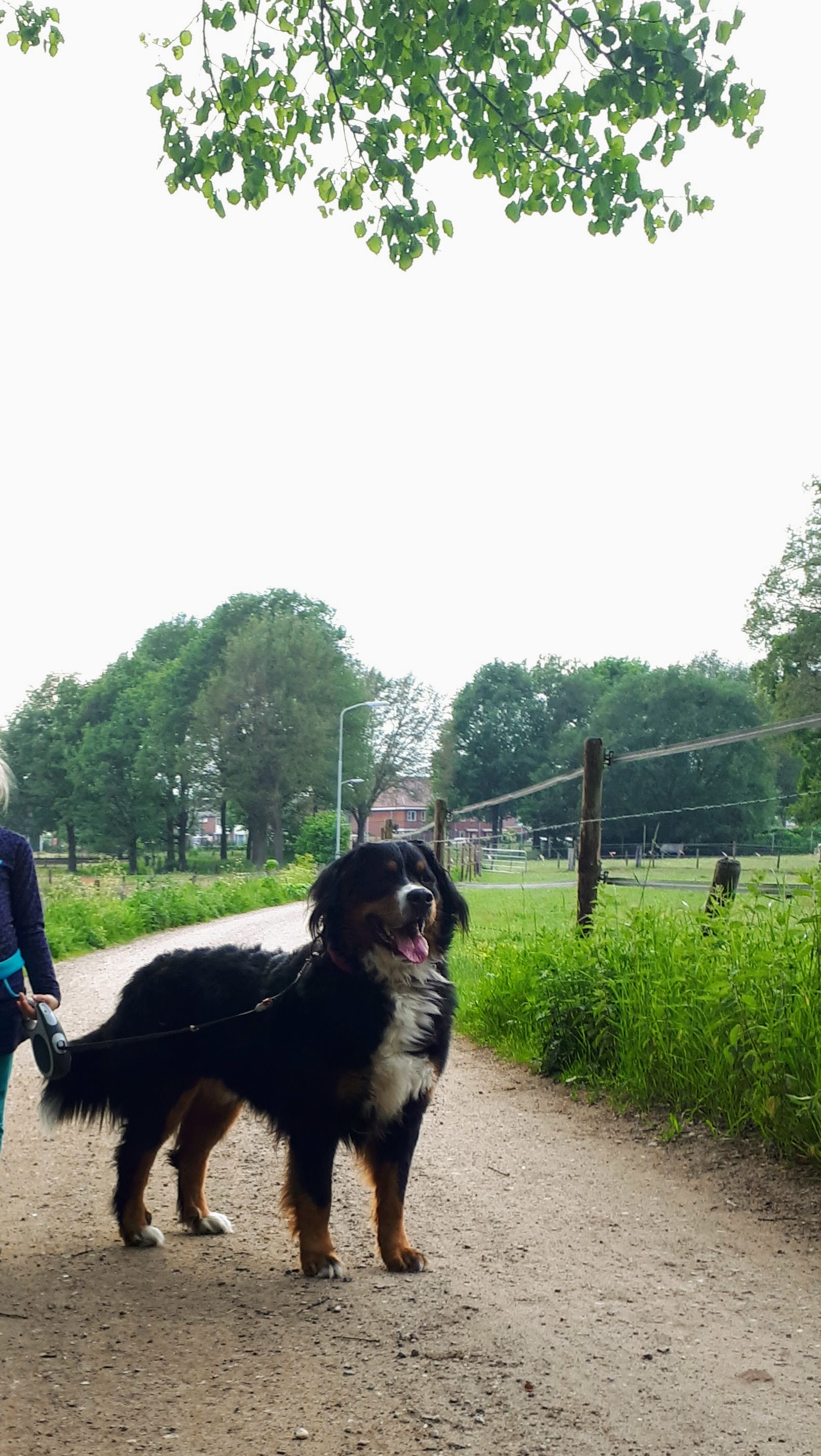 Pebbles: Pebbles is nog steeds een vrolijke, levendige hond, iedere dag lopen we de polder door samen met Puk, onze andere berner. Nu in de corona tijd lopen we toch iedere x verdere rondjes, echt lekker met dat mooie weer,