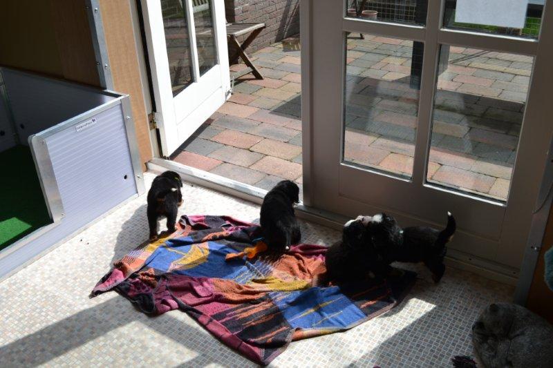 Voor het eerst aan de geweekte brokjes in puppymelk. Wij worden heel goed opgevoed en dat is natuurlijk te zien aan de foto's; orde tijdens het eten........ en daarna eens even kijken of we naar buiten durven.....