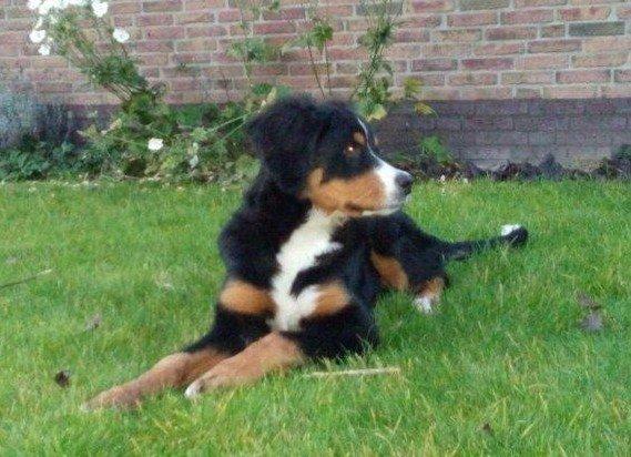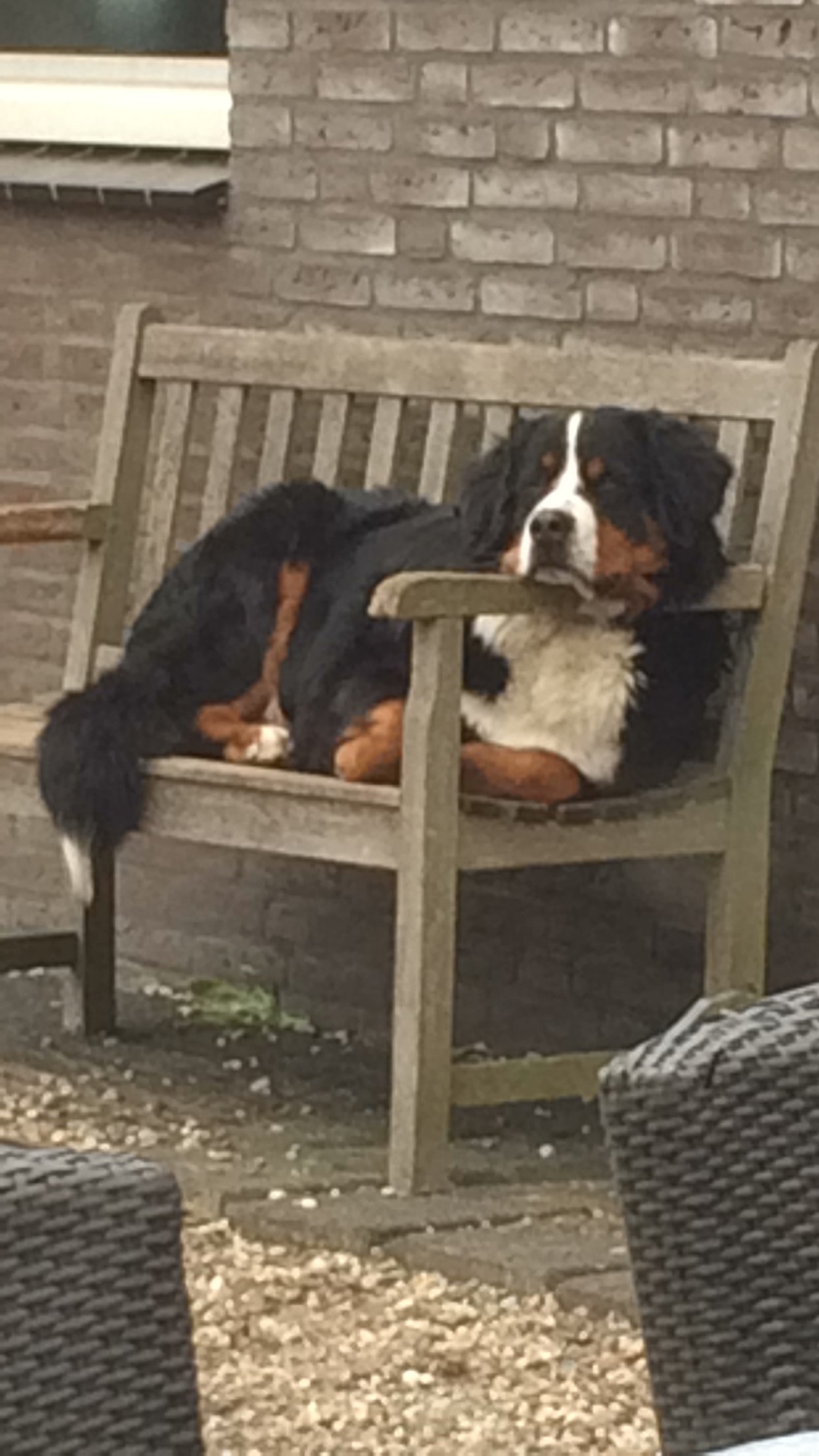 Bella: Onze Bella alweer 1 jaar ! Wij hadden al 2 honden, pukkie, een kruising mops en Boy een Engelse Springer Spaniel. Heel erg graag wilden wij een Berner Sennen, omdat dit Ras erg goed op onze zorgboerderij leek te passen. En zo kwam Bella als pup van 8 weken bij ons wonen. Al snel was zij de baas over Pukkie en Boy, die alles gelaten toelieten. Op dit moment slapen zij met zijn drieen in de hondenmand dus dat zit wel snor. De deelnemers waren meteen dol op haar en zij op de deelnemers. Bella is onze knuffelkont en erg sensitief. Als een van de deelnemers niet goed in zijn/haar vel zit, is daar Bella die op schoot kruipt om te troosten. Dat op schoot kruipen was natuurlijk niet de bedoeling, want zo waarschuwde wij.... ze wordt erg groot en zwaar hoor ! Maar dat maakt hier niemand iets uit. En zo wordt Bella hier de hele dag geknuffeld en knuffelt zij met de deelnemers. Vreemde mensen vindt ze nog wel wat eng maar als je eenmaal binnen bent dan kun je alle aandacht krijgen. Al even enthousiast doet zij mee met de hondentraining die op de zorgboerderij wordt gegeven. Braaf bij elke deelnemer die met haar loopt. Wij zijn dolblij met haar.