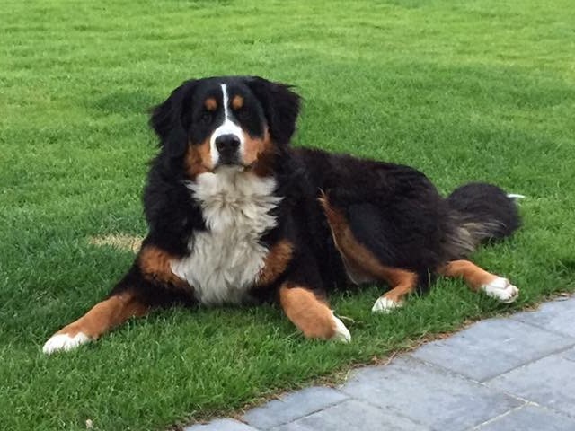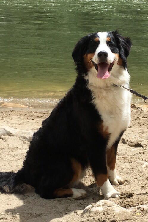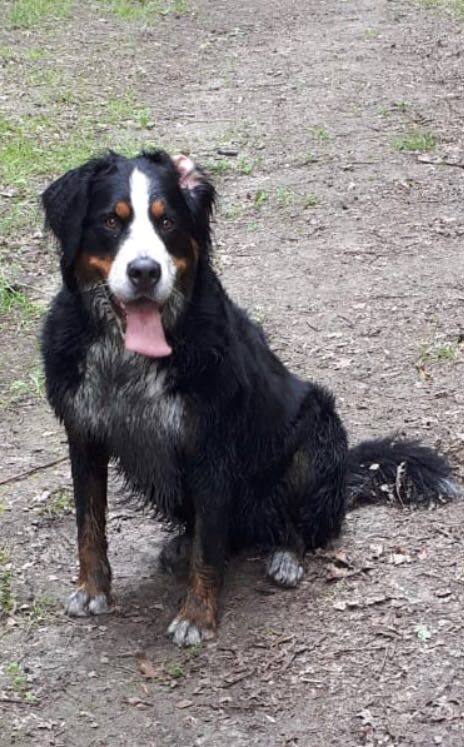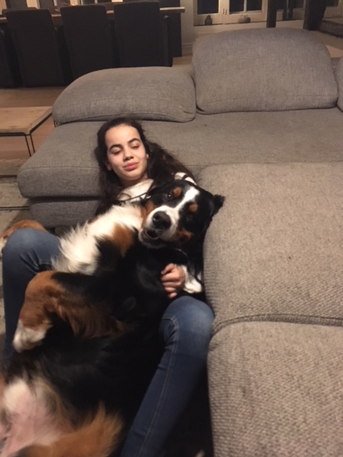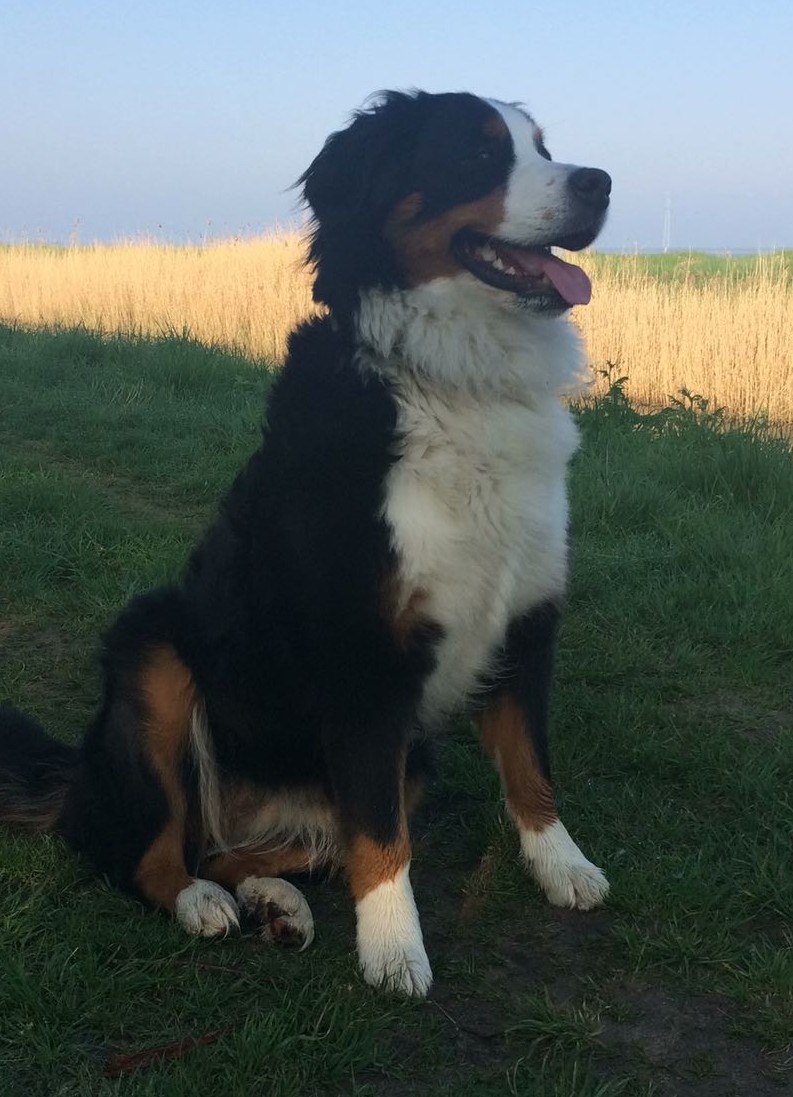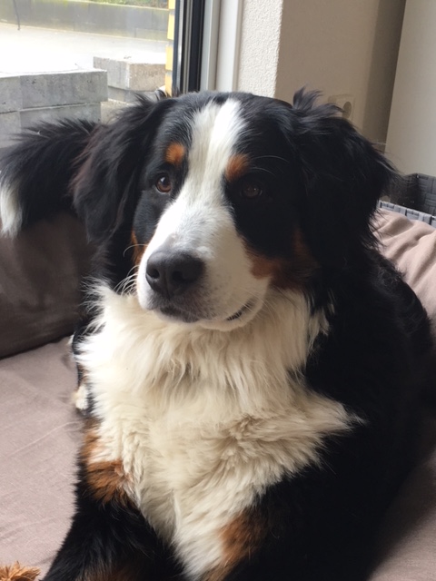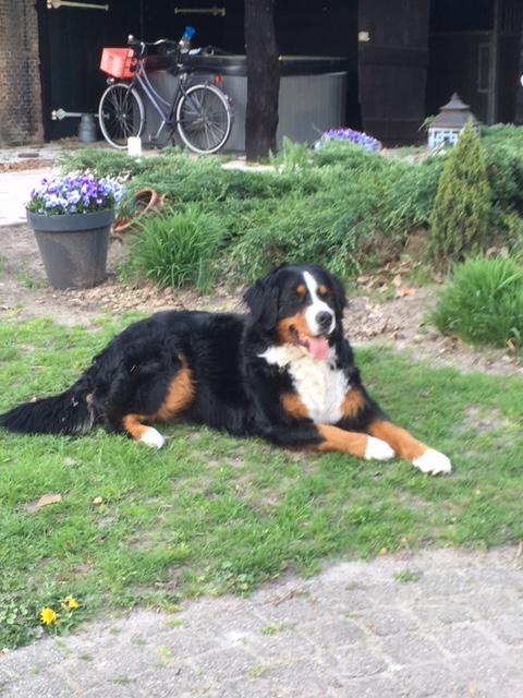 Kay: Hij is inmiddels uitgegroeid tot een lieve, inmiddels iets rustiger en bere-sterke berner. Dat laatste heb ik eergisteren nog mogen ervaren toen ik door hem gelanceerd werd doordat hij achter een hond aanging. Op die momenten dat hij zijn gewicht (47,5 kilo) in de strijd gooit is er voor mij geen houden aan. We zitten nu midden in onze verhuizing, dichterbij de kinderen, kleinkinderen en zijn vriendinnetje Tess waar hij ook allemaal dol op is. Kay gaat altijd graag mee met de auto of het nu naar de dijk, het strand of bos is, zeker als er ook meerdere bernervriendjes komen. Het is een echte lieve stoere allermansvriend geworden.