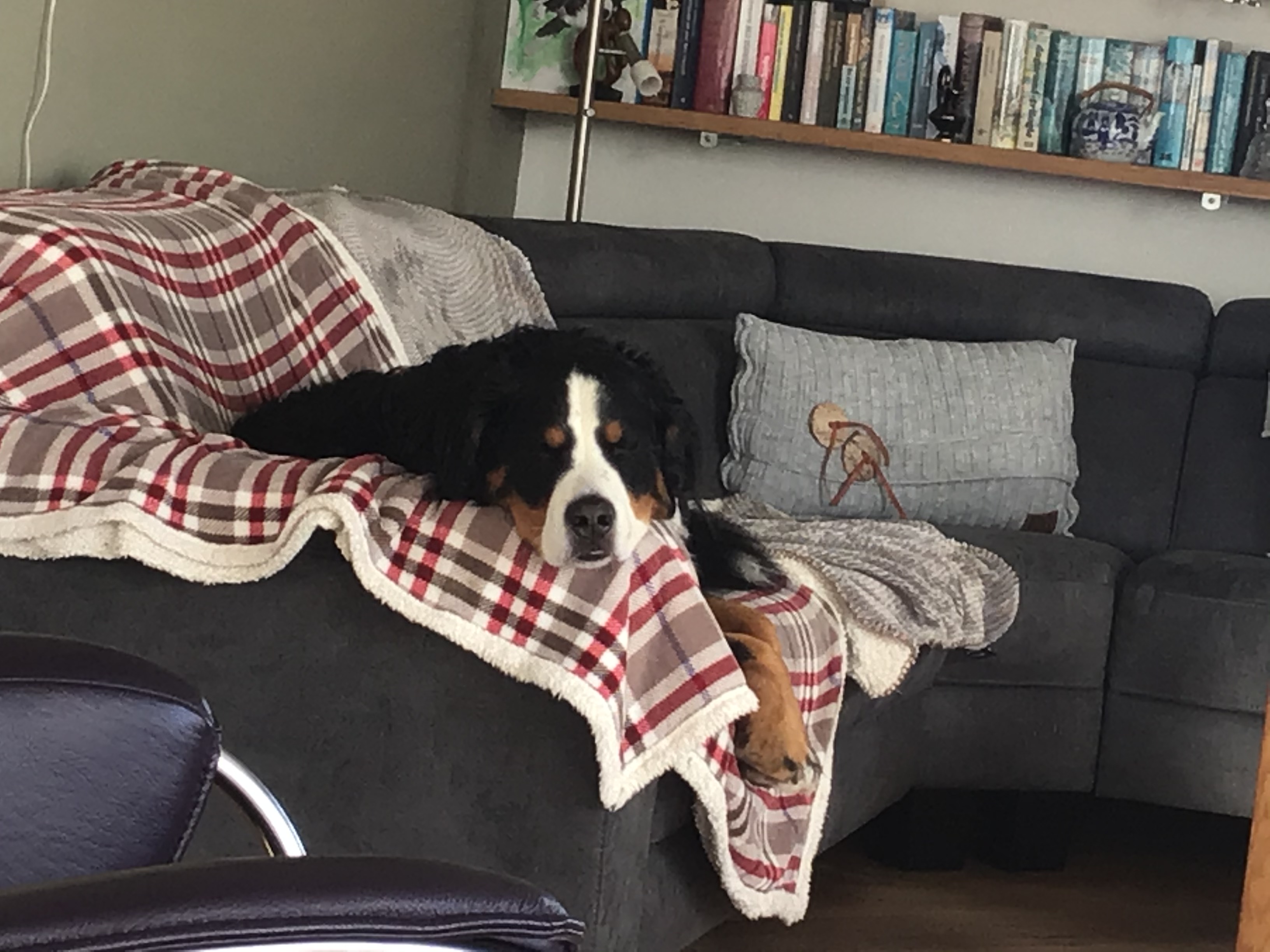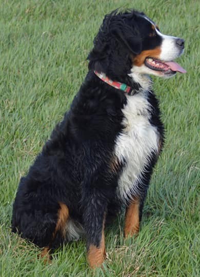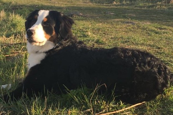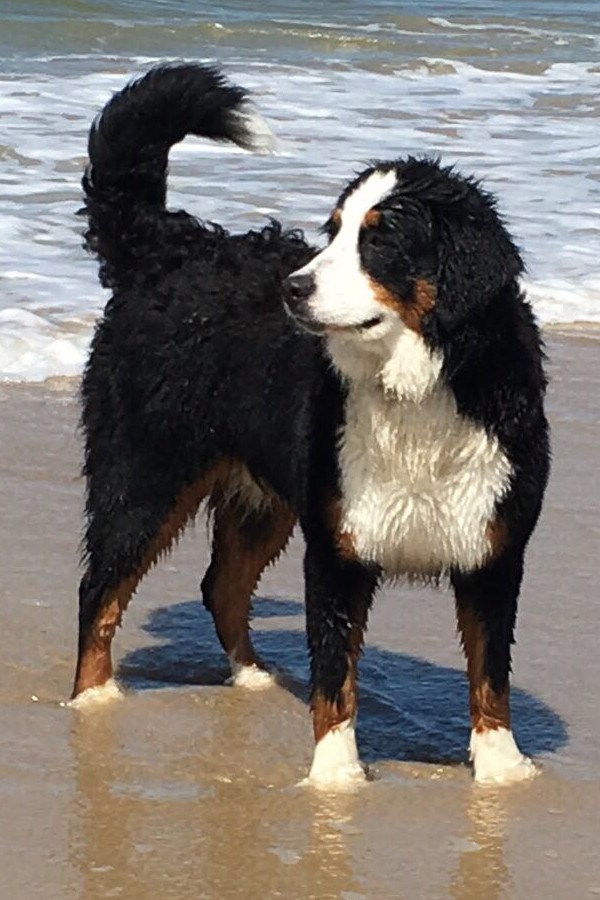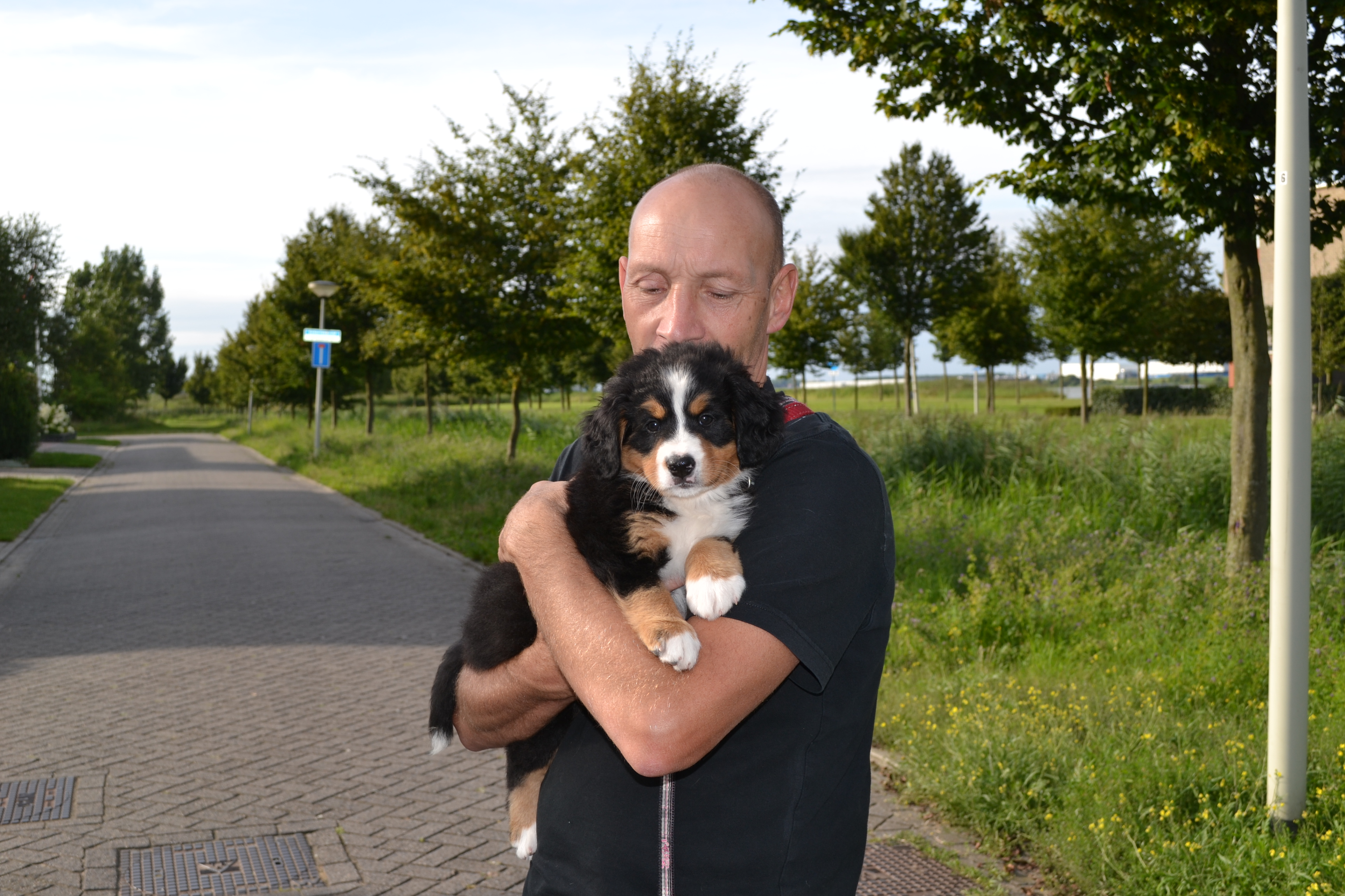 Kay: Hij is inmiddels uitgegroeid tot een lieve, inmiddels iets rustiger en bere-sterke berner. Dat laatste heb ik eergisteren nog mogen ervaren toen ik door hem gelanceerd werd doordat hij achter een hond aanging. Op die momenten dat hij zijn gewicht (47,5 kilo) in de strijd gooit is er voor mij geen houden aan. We zitten nu midden in onze verhuizing, dichterbij de kinderen, kleinkinderen en zijn vriendinnetje Tess waar hij ook allemaal dol op is. Kay gaat altijd graag mee met de auto of het nu naar de dijk, het strand of bos is, zeker als er ook meerdere bernervriendjes komen. Het is een echte lieve stoere allermansvriend geworden.