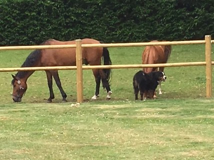 Beer: over onze pup kunnen we boeken vol schrijven! Hij is echt zoon andere hond als Flo, daar verbazen we ons dagelijks over. Beer is denk ik de enige Berner met ADHD.... wat n energie heeft hij!!!! En streken heeft hij ook bij zich. We hebben een omheind terrein waar niks in of uit kan, maar onze Houdini lukt het om door het smalste openingetje (hij graaft hett gewoon groter) te ontsnappen. We inspecteren inmiddels wekelijks het hek op ontsnappingsmogelijkheden. Hij is dol op onze twee paarden en zij op hem! Flo is natuurlijk al wat middelbaar aan het worden, dus die is wel eens geirriteerd als Beer weer als een stoomwals langs komt denderen, maar samen het terrein bewaken kunnen ze prima! Beer is altijd blij, kan kunstjes (alles voor een snoepje) en zit het liefst bij je op schoot.... best onhandig met zijn 42 kg! Hij is minder grof gebouwd als we gehoopt hadden, maar met zijn lichtbruine ogen en grote oren die altijd actief staan, vind ik hem natuurlijk toch de mooiste!!