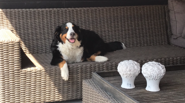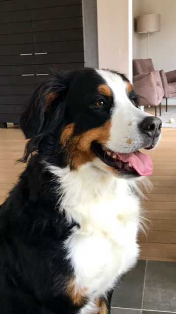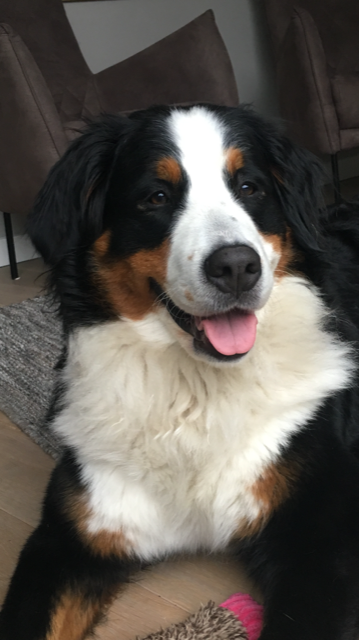 Kay: Hij is inmiddels uitgegroeid tot een lieve, inmiddels iets rustiger en bere-sterke berner. Dat laatste heb ik eergisteren nog mogen ervaren toen ik door hem gelanceerd werd doordat hij achter een hond aanging. Op die momenten dat hij zijn gewicht (47,5 kilo) in de strijd gooit is er voor mij geen houden aan. We zitten nu midden in onze verhuizing, dichterbij de kinderen, kleinkinderen en zijn vriendinnetje Tess waar hij ook allemaal dol op is. Kay gaat altijd graag mee met de auto of het nu naar de dijk, het strand of bos is, zeker als er ook meerdere bernervriendjes komen. Het is een echte lieve stoere allermansvriend geworden.